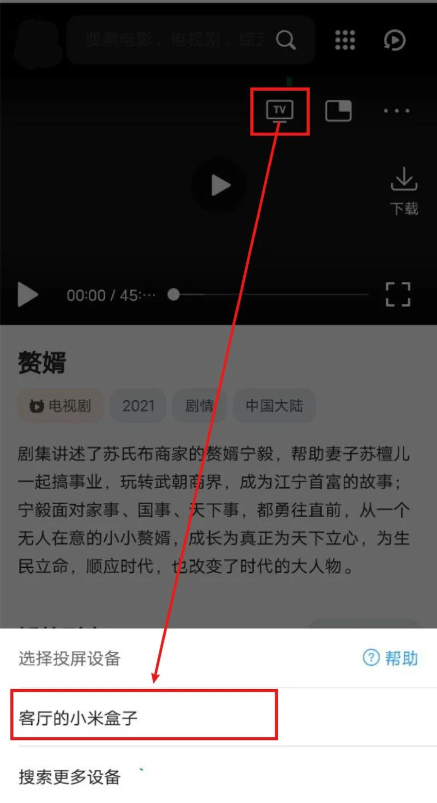 打开QQ浏览器(会接管网页播放器)->打开免费电影在线观看->播放视频->选中投屏图标->等待搜寻出智能电视/电视盒子->选中,即可投屏。