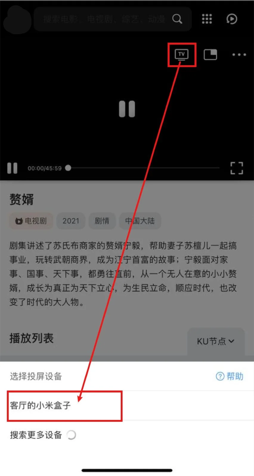 打开QQ浏览器(会接管网页播放器)->打开免费电影在线观看->播放视频->选中投屏图标->等待搜寻出智能电视/电视盒子->选中,即可投屏。